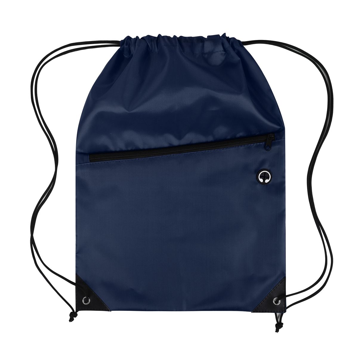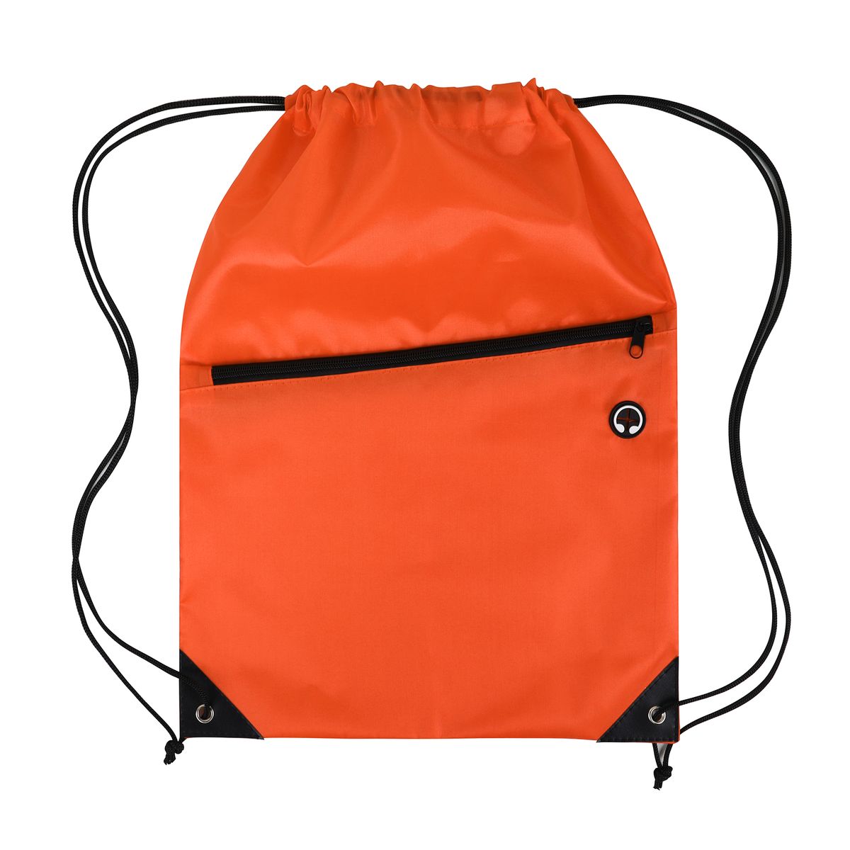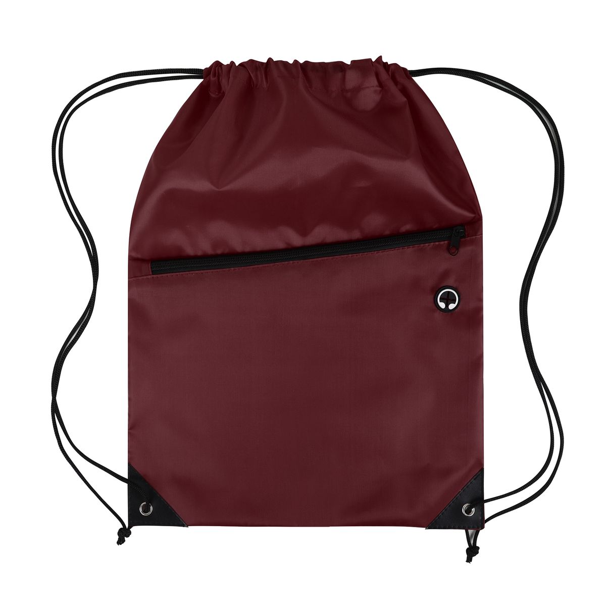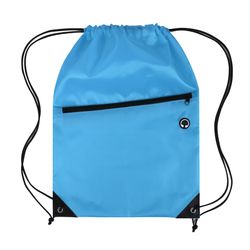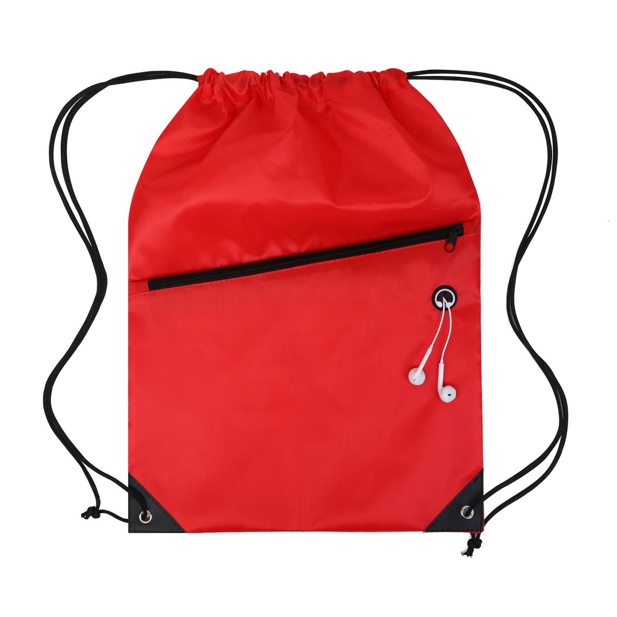 This drawstring backpack is made from durable 210D polyester and features a black adjustable drawstring closure for a secure and comfortable fit. It includes a spacious front zippered pocket with a built-in slot for earbuds—perfect for keeping your essentials organized and accessible. Reinforced with black PU leather corners and sturdy metal grommets, this bag is built to last through everyday use. Ideal for graduations, trade shows, and other promotional events, it's a practical and stylish giveaway item that leaves a lasting impression. Complies with CPSIA, Prop 65.