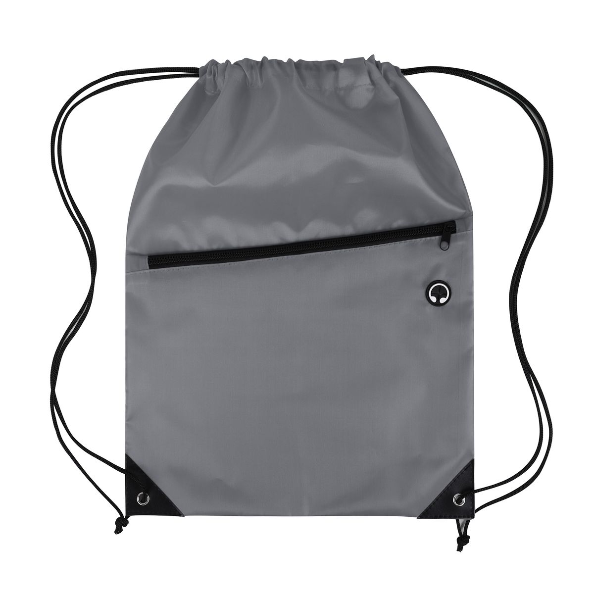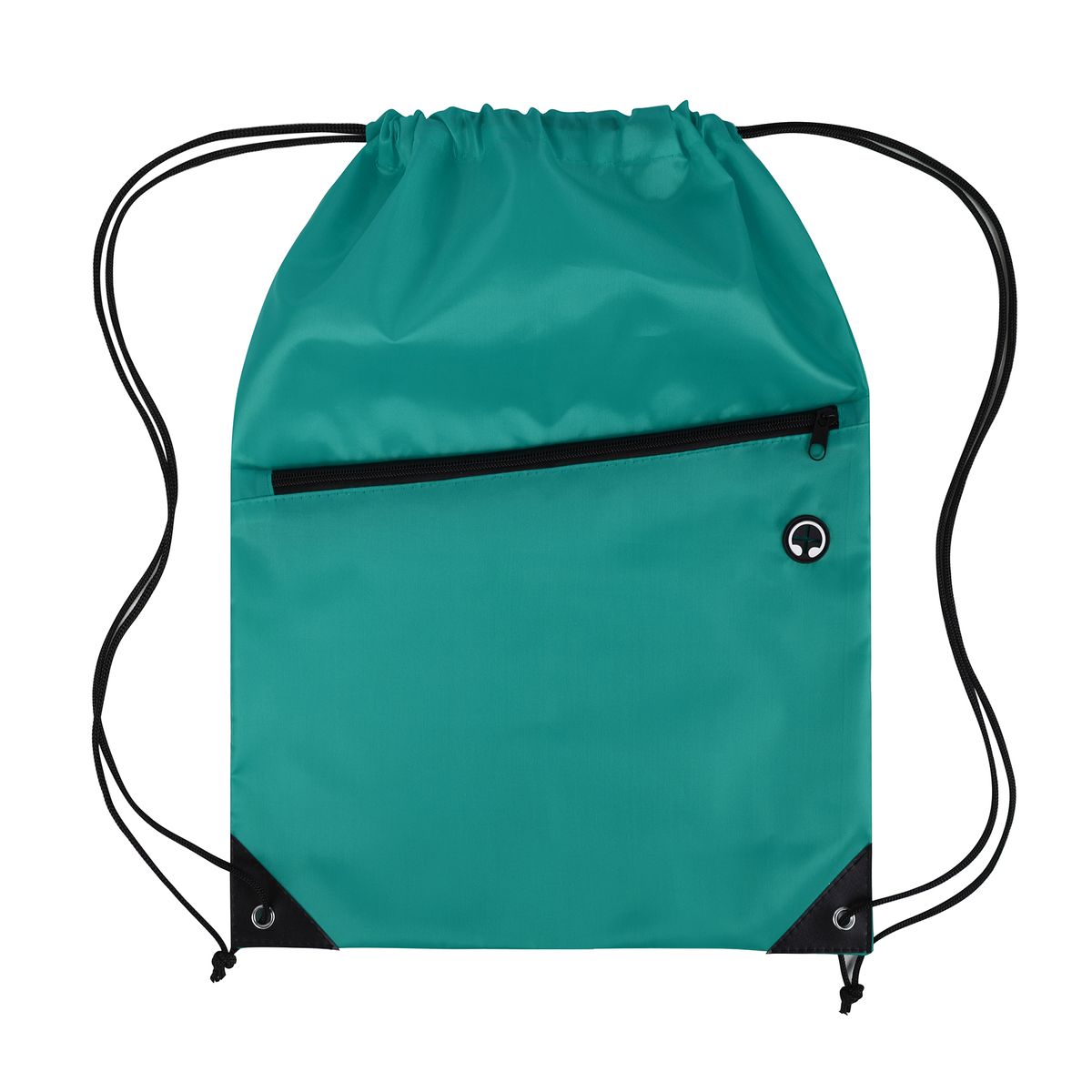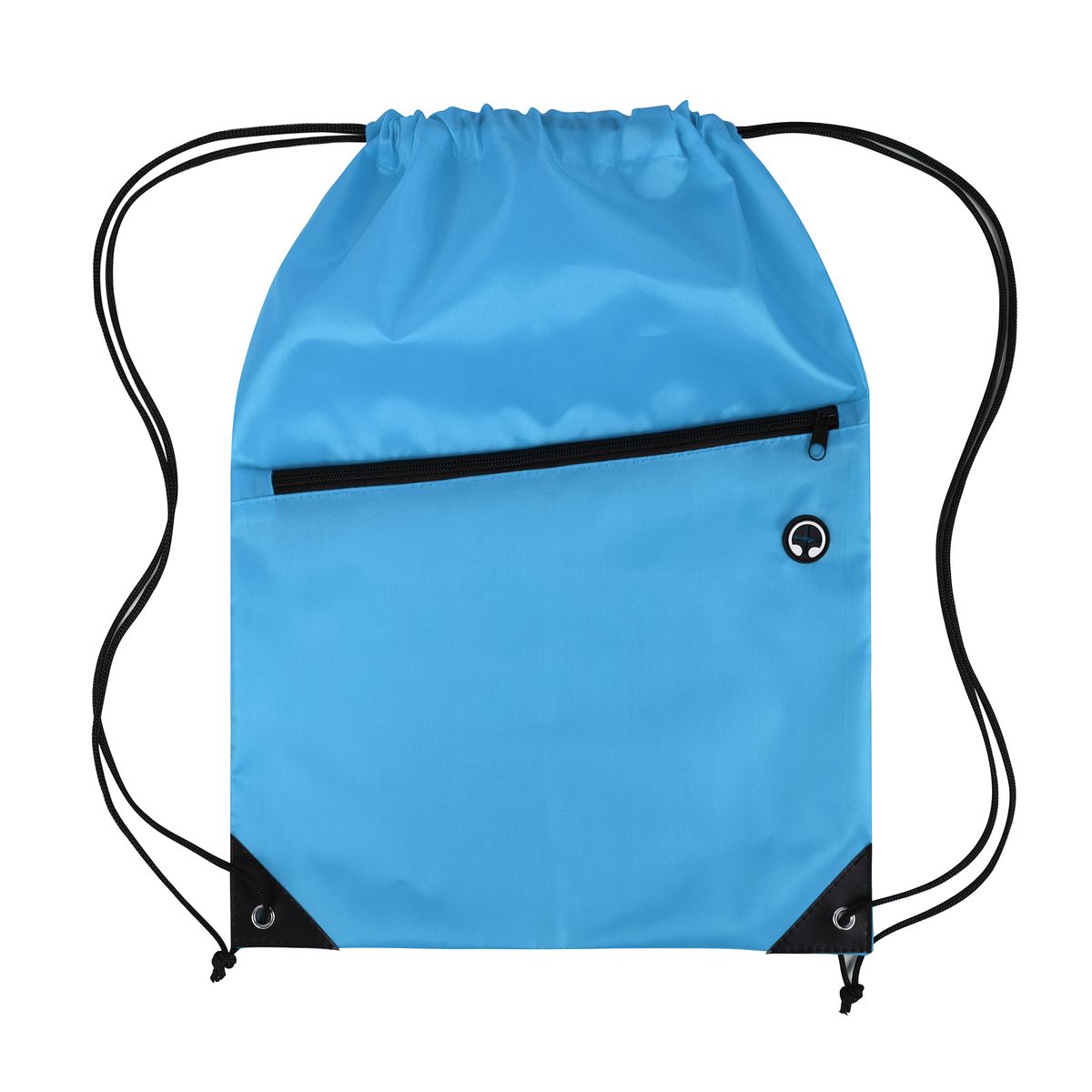 This drawstring backpack is made from durable 210D polyester and features a black adjustable drawstring closure for a secure and comfortable fit. It includes a spacious front zippered pocket with a built-in slot for earbuds—perfect for keeping your essentials organized and accessible. Reinforced with black PU leather corners and sturdy metal grommets, this bag is built to last through everyday use. Ideal for graduations, trade shows, and other promotional events, it's a practical and stylish giveaway item that leaves a lasting impression. Complies with CPSIA, Prop 65.
