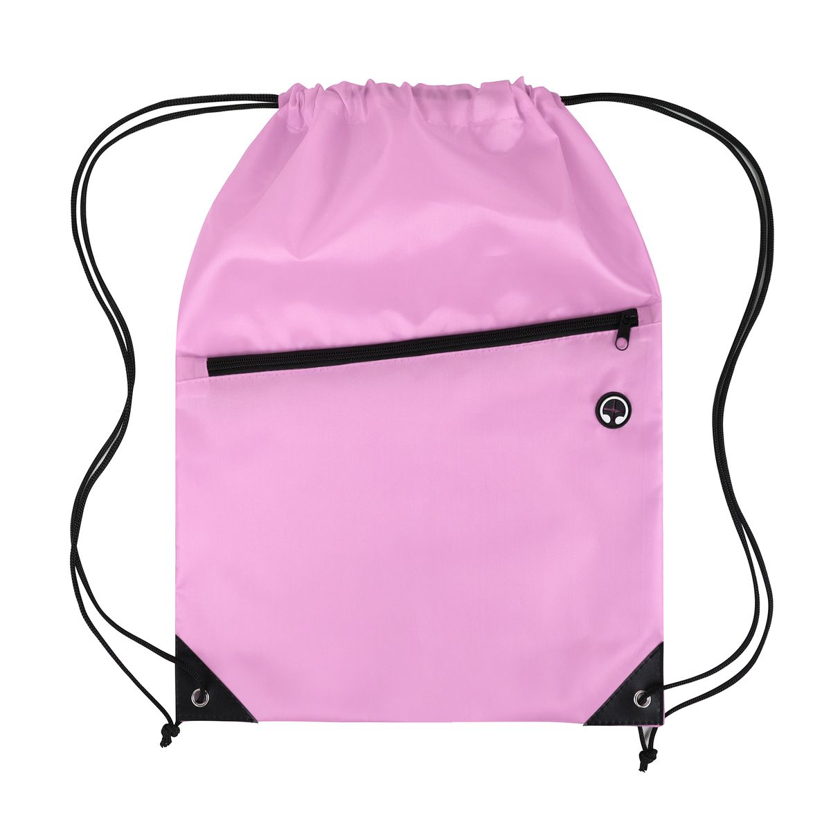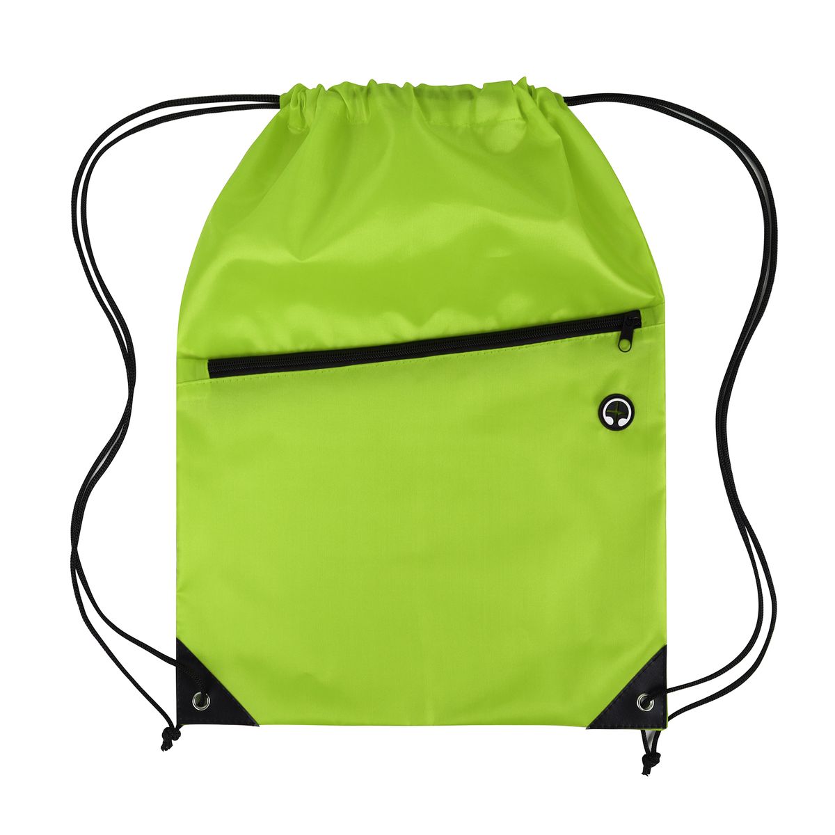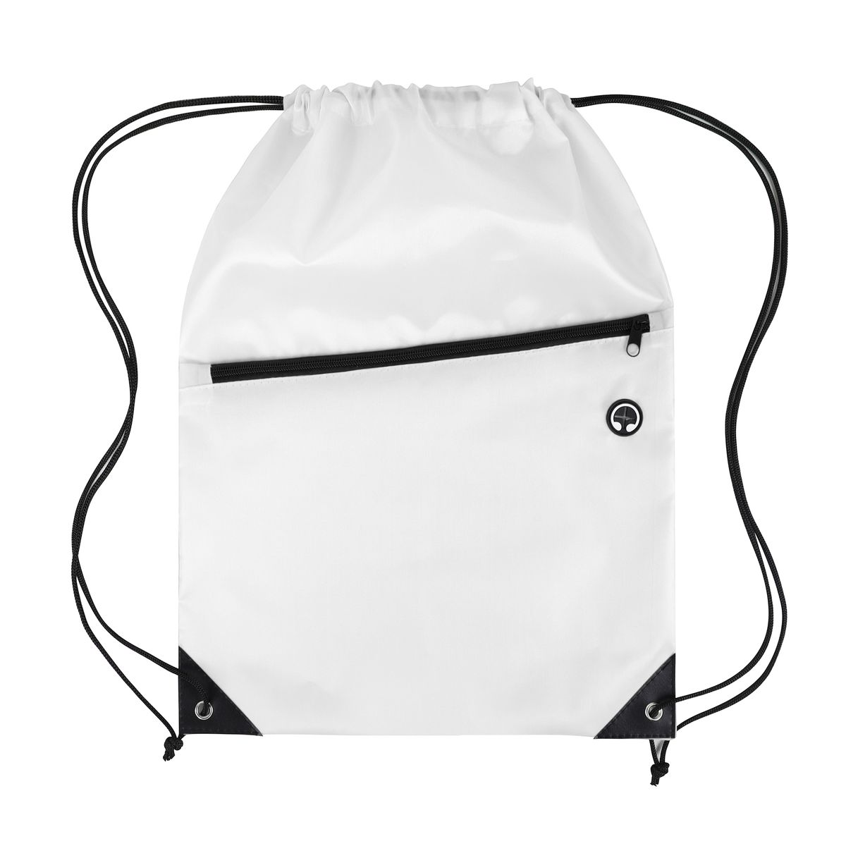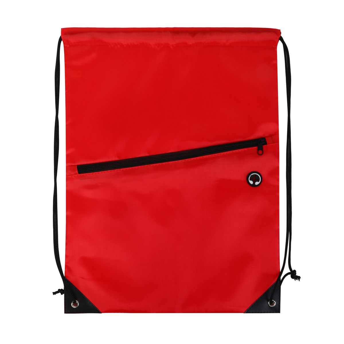 This drawstring backpack is made from durable 210D polyester and features a black adjustable drawstring closure for a secure and comfortable fit. It includes a spacious front zippered pocket with a built-in slot for earbuds—perfect for keeping your essentials organized and accessible. Reinforced with black PU leather corners and sturdy metal grommets, this bag is built to last through everyday use. Ideal for graduations, trade shows, and other promotional events, it's a practical and stylish giveaway item that leaves a lasting impression. Complies with CPSIA, Prop 65.